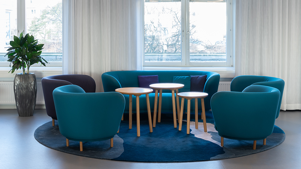 Sisab Skolfastigheter har möblerat med Locus pelarbord med Shell pall, Puddle soffbord och Press fällbord.