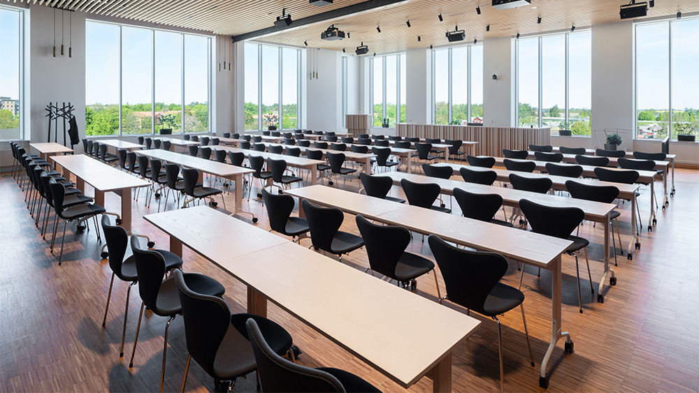 Sammankomsterna i kommunfullmäktiges sal i Kävlinge Kommunhus sitter man vid det flexibla och fällbara bordet Rollo från Karl Andersson & Söner. I övriga delar hittar men klädhängare Nest och tidskriftsstället Front.