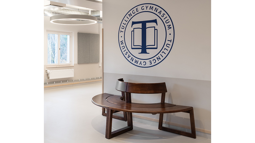 I korridorer på Tullinge Gymnasium finns Meander soffa i olika varianter. Allt är tillverkat i massiv ask med ytbehandling valnötsbets.