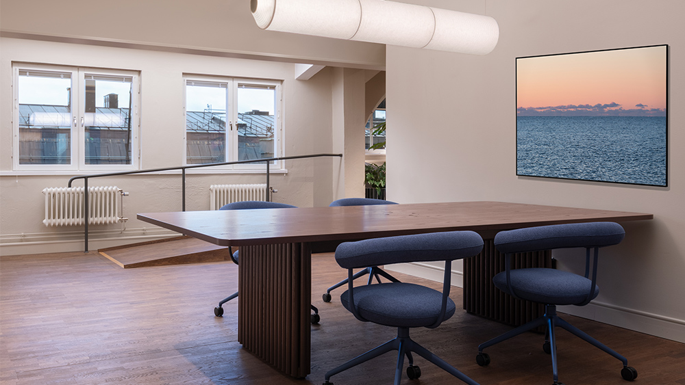Opera konferensbord hos Deloitte är försedd med kabelgenomföring för att själva välja vilka eluttag som önskas. Eluttagen läggs under locket, kabel dras genom bengavel. Inga synliga kablar som hänger under bordet.