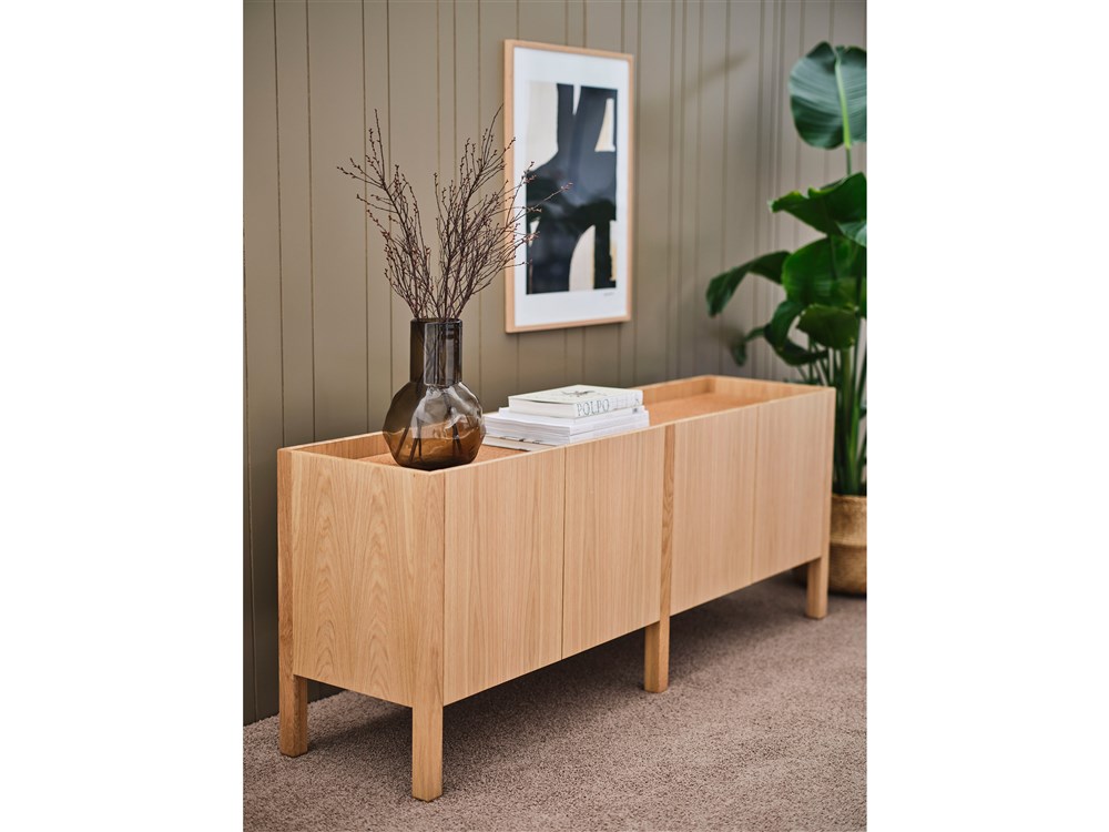 Upper är tillverkat i fanerad MDF. Utförande är ek, ask, standardfärger, standardbetser på ask och vitpigmenterad ek eller ask. Som tillval finns låsbara hjul och krönskivor i vitt glas, kork, rostfritt stål, ek, ask, standardfärger eller standardbetser. Benstativet är försedd med justerbara ställfötter. Skåpet levereras monterat. Skåpet kan användas som avdelare i ett rum, bakom en soffa eller längs en vägg.