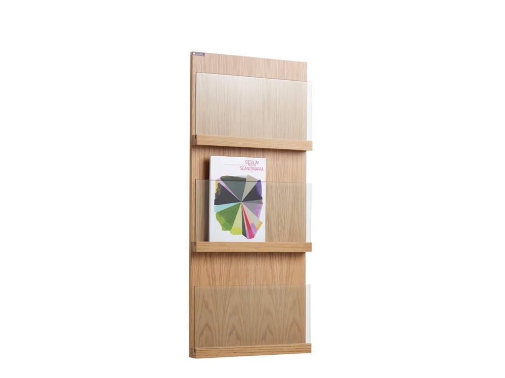 Special sizes and ther finishes upon request. It is secured to the wall using a metal rail. The ledges in solid wood and back in MDF of veneer in oak, birch, standard colors, standard stains on oak and white glazed oak. Finish clear lacquer. Tempered clear glass in height 32, 150 (=A5) or 230 (=A4) mm as standard and plexiglass upon request. Instead of glass for magnetic whiteboard and notice board you can choose of 15 mm wood end. Accessories: Dividers in solid wood that slot on top of the glass fronts to divide each shelf into compartments.