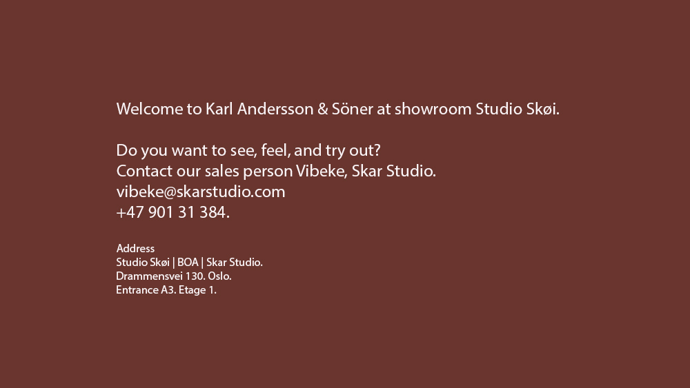 Contact our sales person Vibeke, Skar Studio - vibeke@skarstudio.com tel. +47 901 31 384.